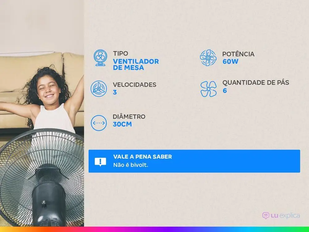 Uma opção prática, portátil e mais econômica para mandar embora o calor é o Ventilador, não é mesmo? Se você tá pensando em comprar um novo, olha só esse Ventilador de Mesa da Britânia. O Ventilador Britânia BVT301 é uma ótima opção para refrescar com várias funções para o seu bem-estar! São 3 velocidades que se adequam a sua necessidade, escolha entre as opções suave, moderado e intenso. A potência de 60W, a hélice com novo formato e a tecnologia Maxx Force, hélice de 6 pás com 30cm, desempenham com maior vazão de ar e capacidade de ventilação. Segurança não é um problema, o motor com fusível térmico interrompe o funcionamento do produto se houver superaquecimento, além do sistema de trava das grades. Tudo isso com baixo consumo de energia em qualquer velocidade, graças à sua classificação energética A. O Ventilador Britânia BVT301 Tecnologia Maxx Force 60W faz toda a diferença para amenizar o calor proporcionando conforto e frescor!
